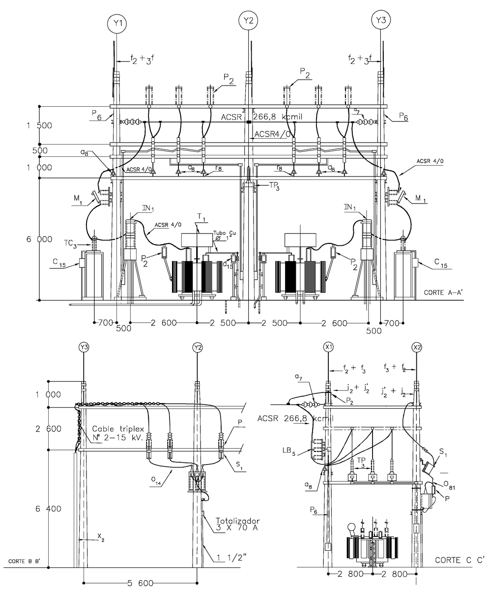 CTR614 Centro de transformación rural 34,5 kV de 2,5 a 10 MVA con celdas. Disposición de equipos, cortes A–A’, B–B’, C–C’
