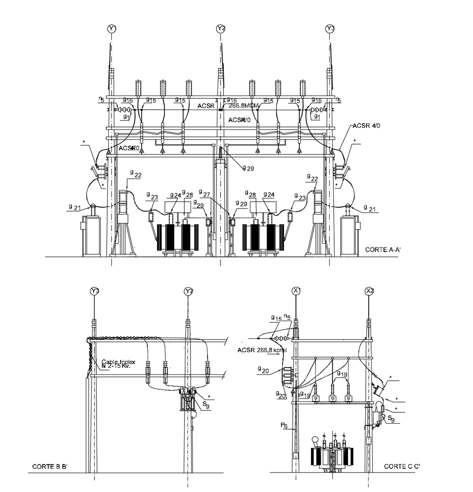 CTR616 Centro de transformación rural 34,5 kV de 2,5 a 10 MVA, con celdas. Enlaces y conectores. Cortes A–A’, B–B’, C–C’