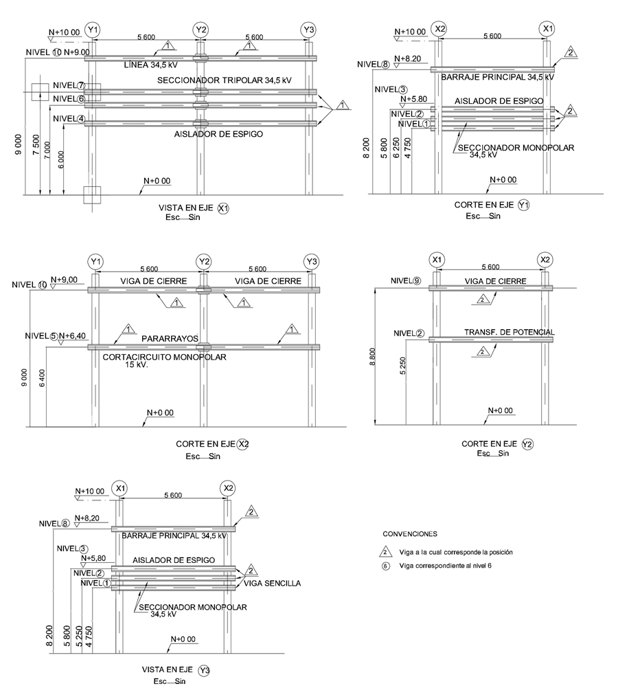 7- Todos los postes entre los niveles N 7 00 y N 9 00, deben estar unidos como mínimo por una cruceta metálica (sea esta viga de cierre o con equipo eléctrico) con el objeto de lograr que las partes trabajen conjuntamente.