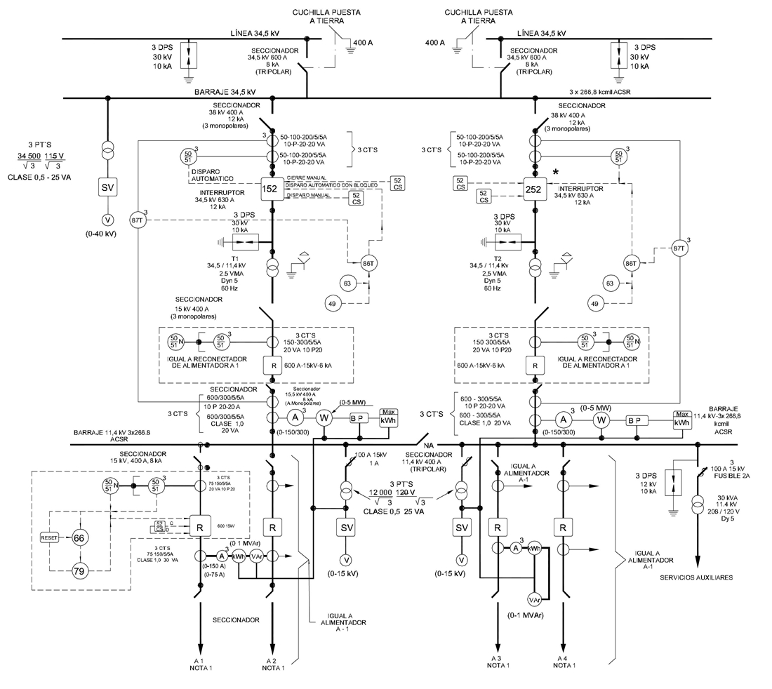 CTR621 Centro de transformación rural 34, 5 kV de 2,5 a 10 MVA, con reconectadores - Diagrama unifilar