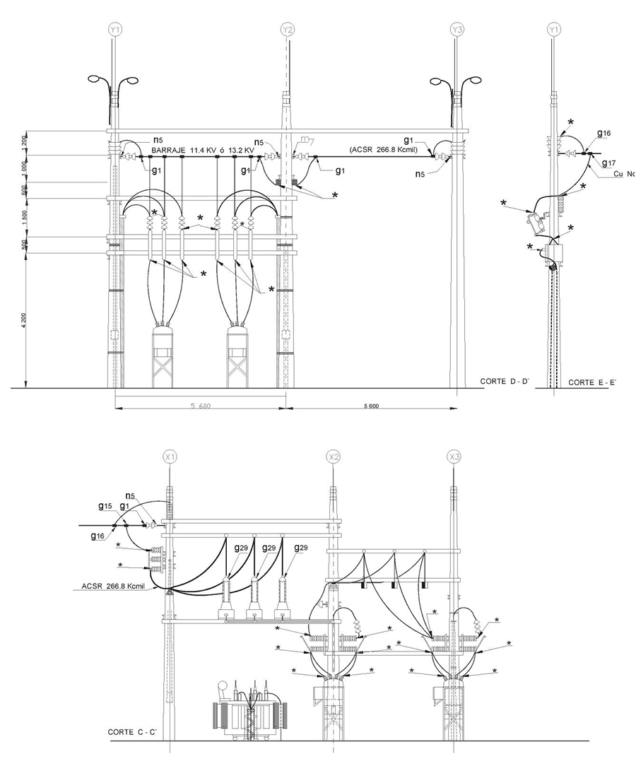 CTR625-1 Centro de transformación rural 34, 5 kV de 2,5 a 10 MVA con reconectadores. Enlaces y conectores. Cortes C-C´, D-D´, E-E´