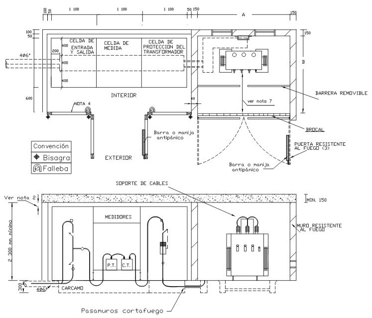 - La puerta debe ser a prueba de fuego acorde con los casos que establece RETIE, en caso contrario implementar celosía. El ala de la puerta no debe ser menor a 900mm y se debe instalar cerradura antipánico acorde con RETIE.