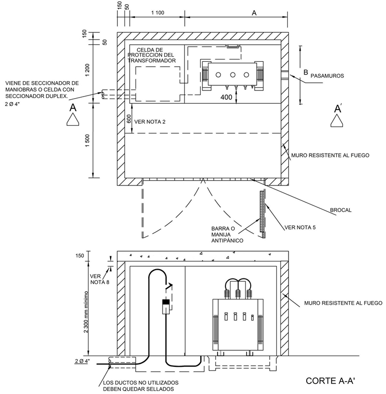 - La puerta debe ser a prueba de fuego acorde con los casos que establece RETIE, en caso contrario implementar celosía. La figura de la puerta es representativa, el ala no debe ser menor a 900 mm y debe llevar cerradura antipánico según RETIE.