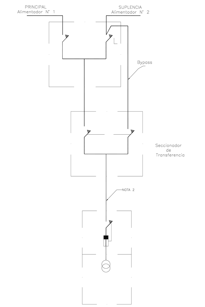 1. este diagrama aplica a alimentadores N.1 y N.2 con disponibilidad de carga de tal forma que el seccionador de transferencia mantenga la suplencia, de los circuitos a través del bypass.