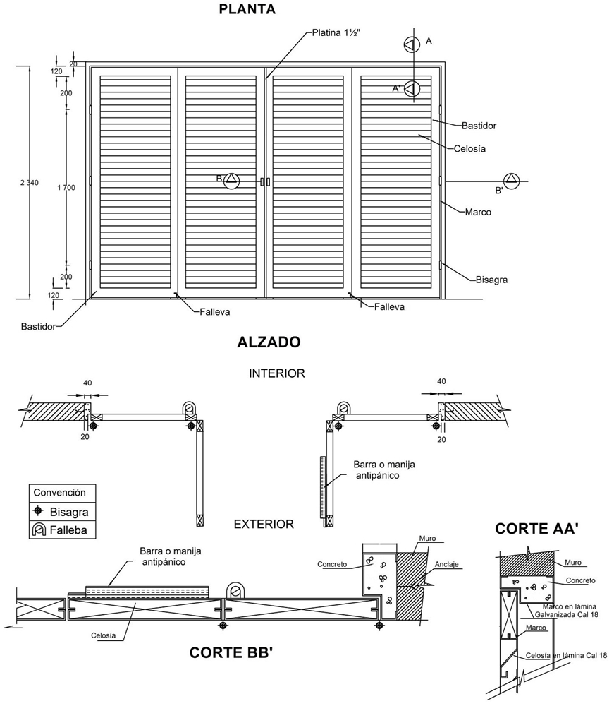 - Las hojas de la puerta no deben ser menores a 900 mm y un en una hoja se debe incluir cerradura antipánico, en cumplimiento con RETIE.