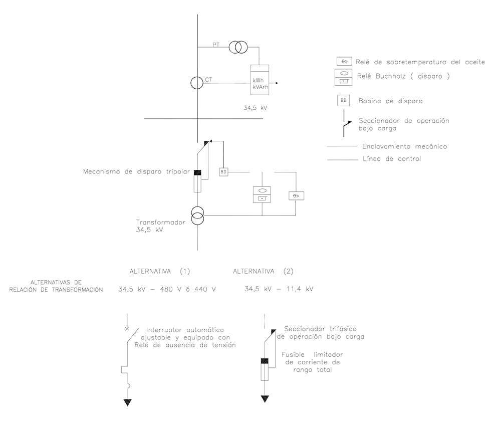 CTS555 Centro de transformación industrial 34,5 kV. Diagrama unifilar de protección y medida para transformadores de 1 000 a 2 000 kVA