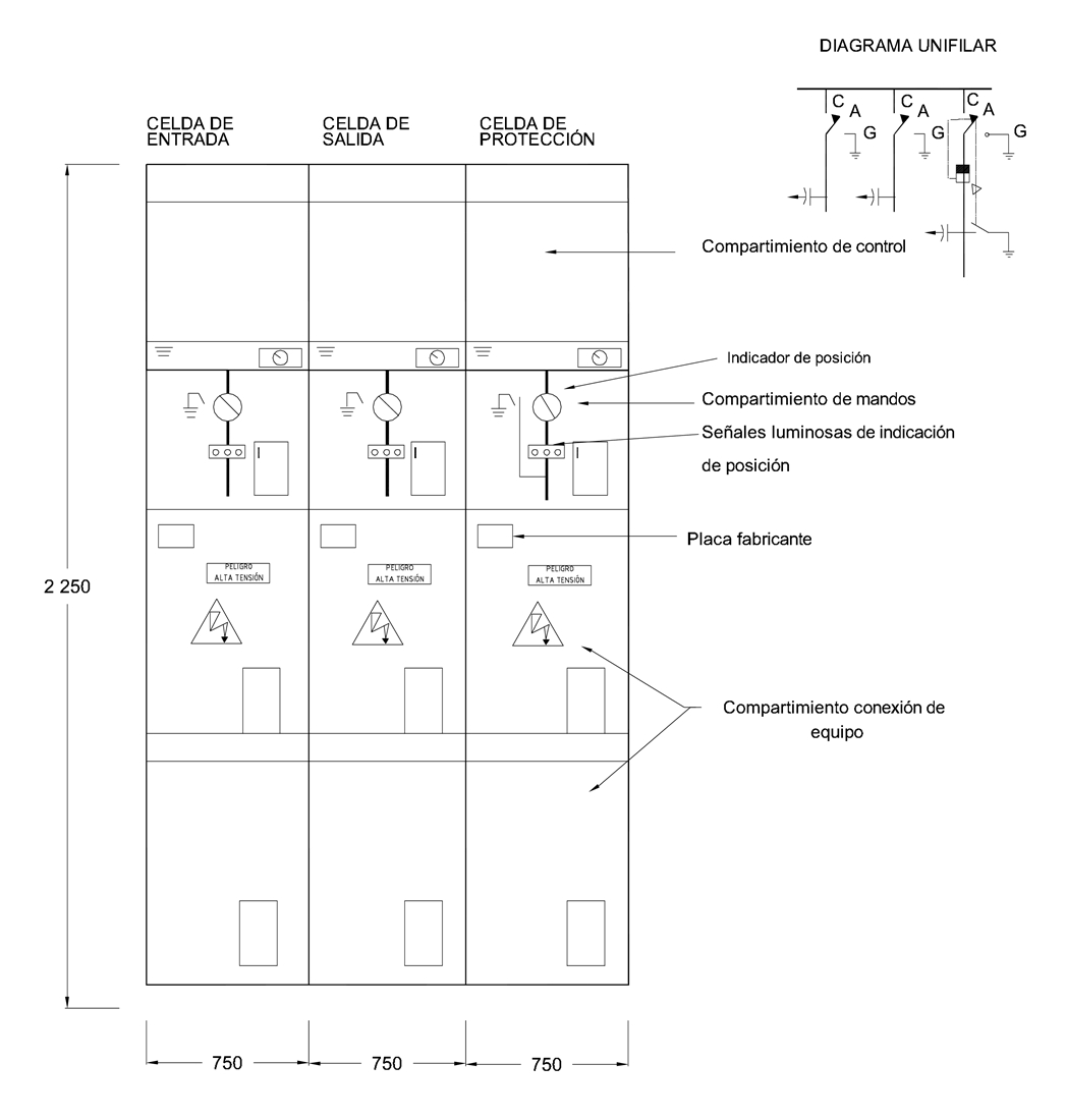 CTS565 Centro De Transformación Industrial 34,5 KV. Celdas Con Seccionadores En SF6 Para Entrada, Salida Y Protección. Vista Frontal