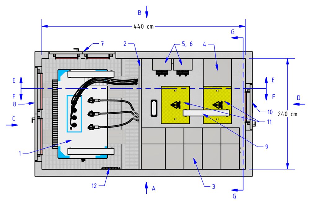 11. Se deben instalar ductos y pasacables IP67 de 6 pulgadas para el ingreso y salida de cables de media tensión y las salidas de baja tensión. La cantidad de ductos se establece acorde con el número de salidas/entradas del Centro de transformación. En media tensión es según la cantidad de celdas (CBL o L) más una reserva. La cantidad de salidas en baja tensión es de mínimo 2 ductos. Se tendrá también en cuenta el número de cables que permita albergar el pasacables IP67.