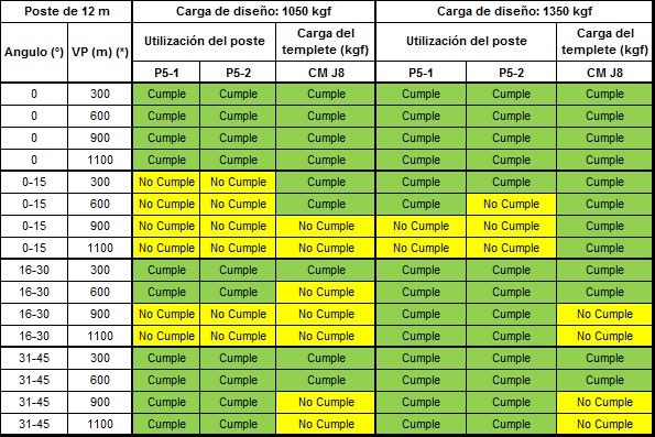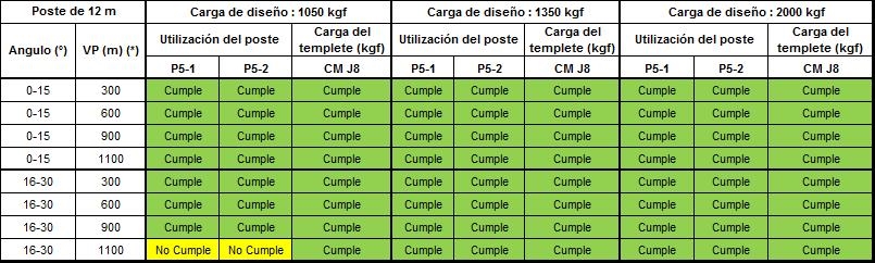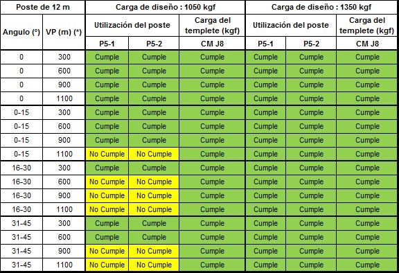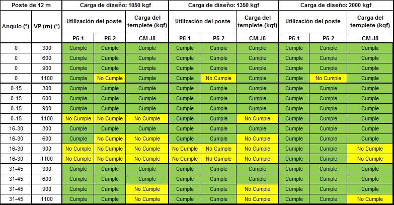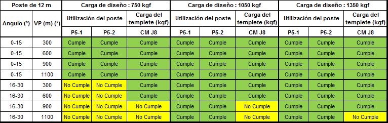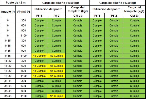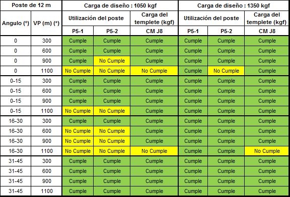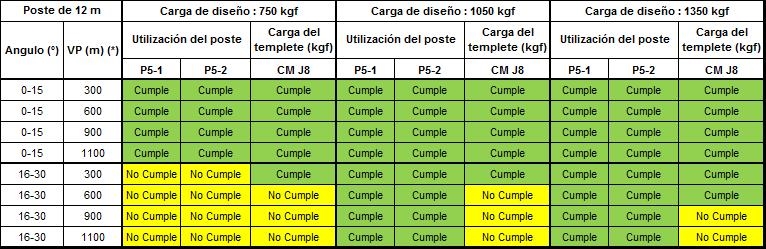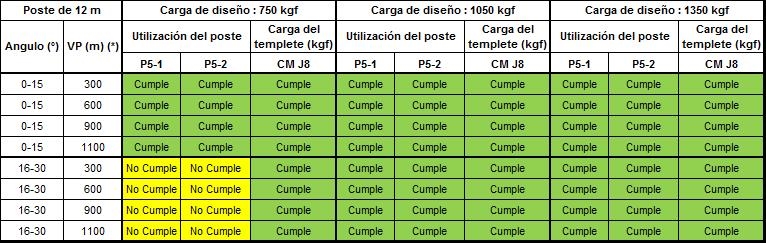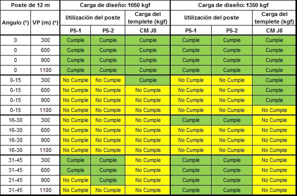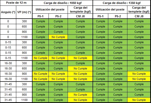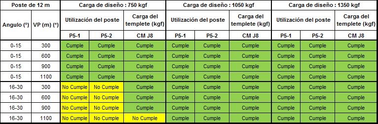 Si alguno de los parámetros tienen al menos un valor de “No cumple” que se representa en color amarillo, dicha configuración no se podrá construir y se debe optar por la opción de estructura estabilizada o validar la siguiente carga superior de diseño del poste.
