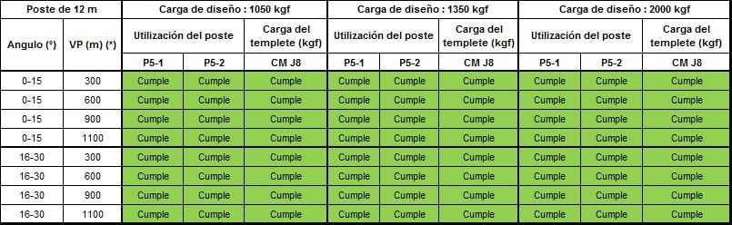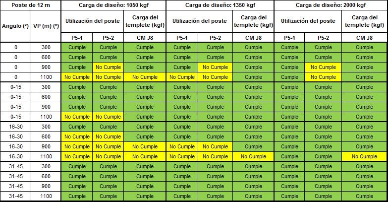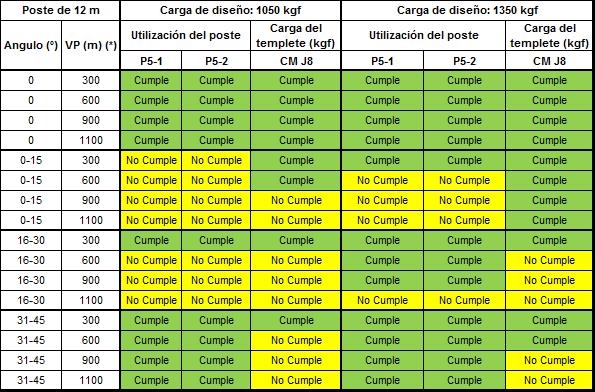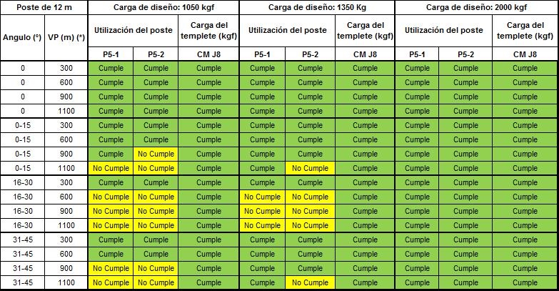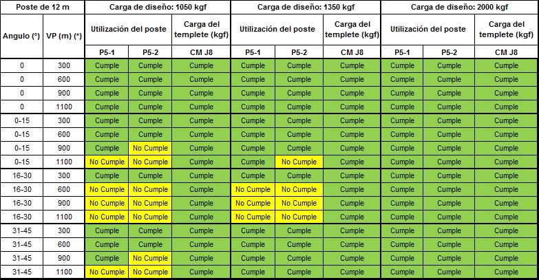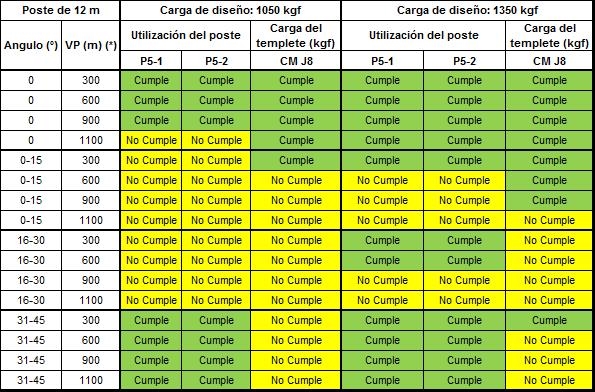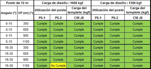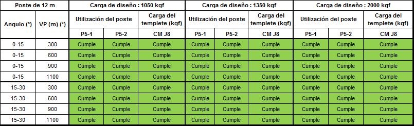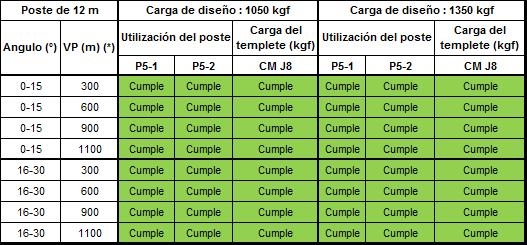 Los postes P5-1, P5-2, P5-3 deben tener el concepto “Cumple” de color verde, lo que significa que no sobrepasa el 40% de la carga de diseño. Los templetes nombrados como J8-X están diseñados con un valor del 50% de la carga de diseño del templete deben tener el concepto “Cumple” en color verde.