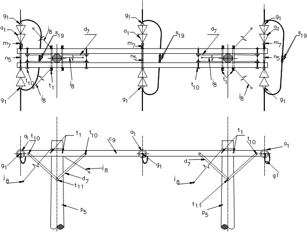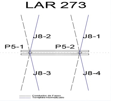 El siguiente diagrama es complementario a la Figura 1, donde se muestra la disposición de los conductores y los templetes en la estructura de retención horizontal en tres postes. Los templetes normalizados están de color azul y de línea continua, los conductores están de color negro y de línea punteada.