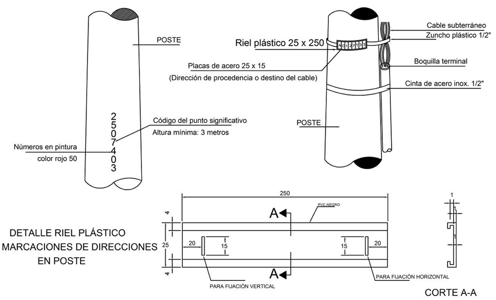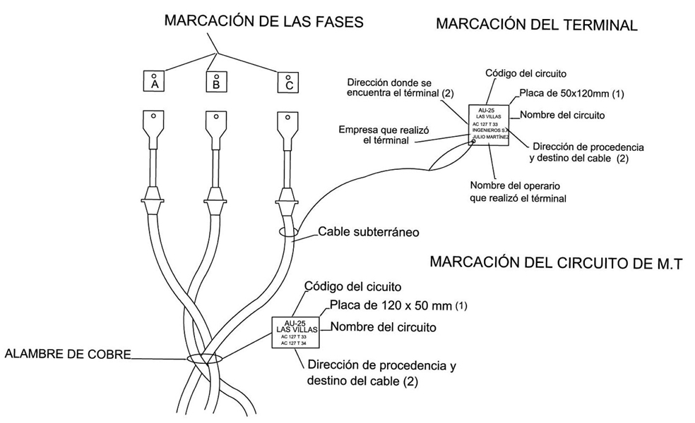 (2) Cuando la dirección de procedencia y destino del circuito ó localización física del empalme y terminal nó puedan establecerse con exactitud, se debe indicar en la marquilla ó placa de la manera más clara y resumida para que sea fácil su ubicación.