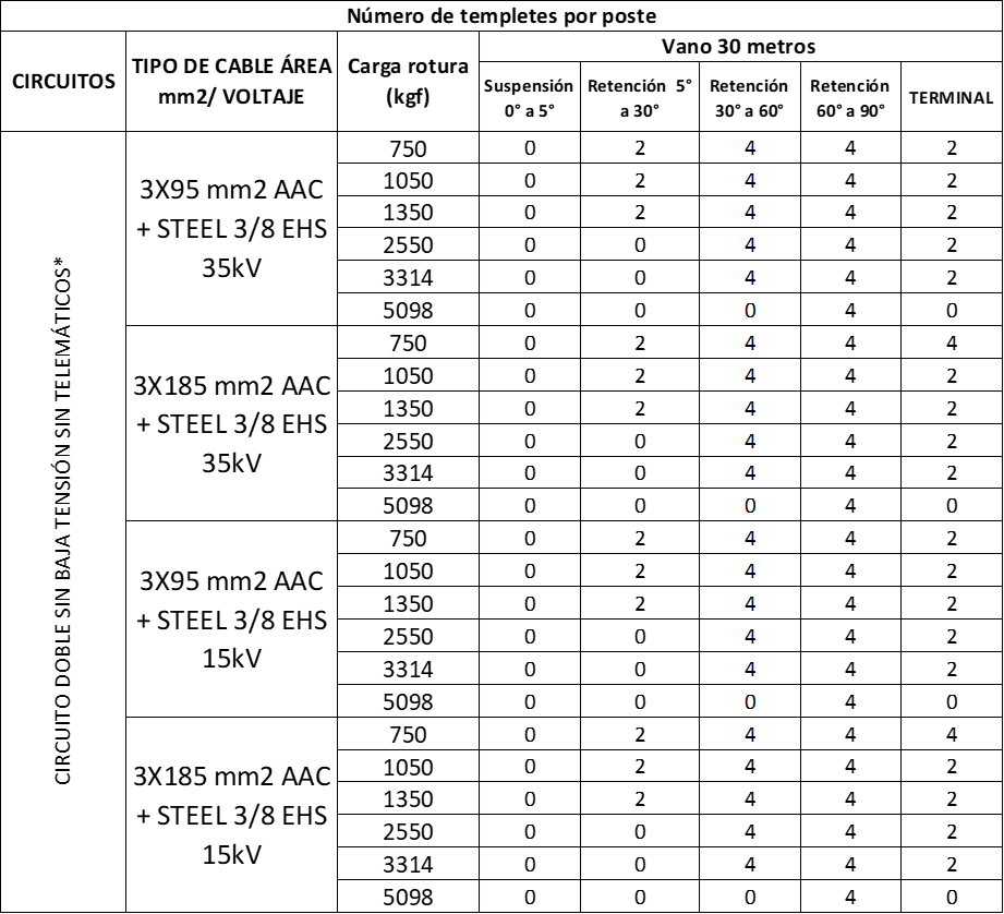 Tabla 14. Vano a 30 metros circuito doble sin BT sin telemáticos