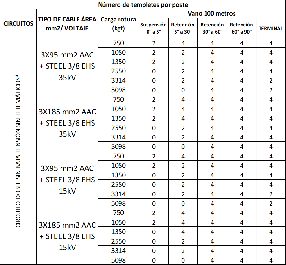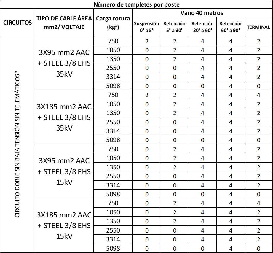 Tabla 21. Vano a 40 metros circuito doble con BT con telemáticos*