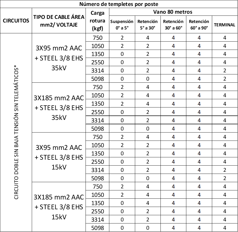Tabla 18. Vano a 80 metros circuito doble sin BT sin telemáticos