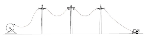 5) Empalmados los dos elementos, el pescante o manila de tracción y el conductor, se pone en marcha el cabrestante y se procede al tendido del cable conductor, accionando el dispositivo de frenado cuando sea preciso, con el objeto que el cable conductor pueda ser afectado al sobre pasar su carga de rotura y el cable no descienda hasta el nivel del suelo. La tensión mínima será aquella que permita hacer circular los conductores sin rozar con los obstáculos naturales, tales como tierra. El personal a cargo del tendido contará con los medios de comunicación adecuados (radio portátil) a fin de mantener el funcionamiento coordinado del cabrestante y el freno. Ver figura No. 6.