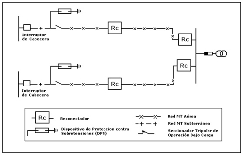 Este esquema se plantea para circuitos que atienden zonas con alto impacto10 por interrupción del servicio de energía y donde las condiciones técnicas los permitan.La operación de los equipos de maniobra se realiza de manera bi-direccional con el fin de aislar selectivamente la zona de falla en eventos de contingencia garantizando la continuidad del servicio. El esquema de anillo abierto con transferencia es utilizado para soporte de cargas sensibles como subestaciones MT/MT, clientes industriales, hospitales, etc, para asegurar que el suministro de tensión desde una red alternativa en el caso de una falla en la red principal. En la Figura 2 se presenta un esquema de la configuración para circuitos en anillo abierto con transferencia.