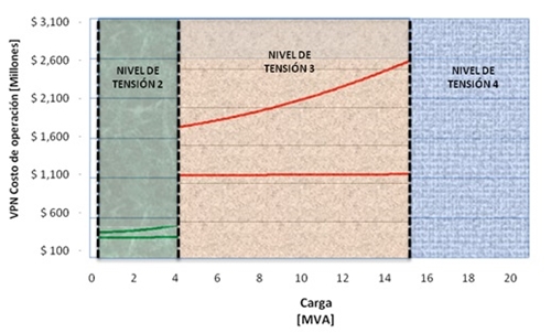 Es de anotar que en estos análisis se verifica que las variables eléctricas estén dentro de los límites de capacidad máxima de corriente y regulación de tensión. Para cargas con potencia demandada mayor a la carga máxima a conectar en nivel de tensión III se conectarán en nivel de tensión IV. Al aplicar la metodología descrita se obtienen resultados para varios escenarios de análisis eléctricos considerando longitudes del alimentador, carga demandada, corriente, pérdidas y regulación de tensión.