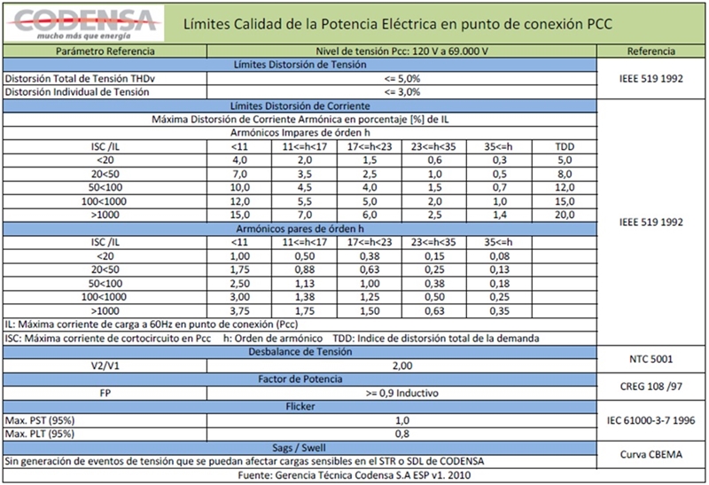 Con el fin de determinar los efectos producidos por el flujo de armónicos, transitorios electromagnéticos y fluctuaciones de tensión y corriente causados por el proceso productivo del cliente sobre el SDL de Enel Colombia, el cliente deberá realizar tres (3) meses después de conectada la carga un estudio de calidad de potencia elaborado por una firma especializada en este tipo de actividades, donde se recolecte información relacionada con la distorsión armónica de tensión THDv, la distorsión total de la demanda TDD, la máxima corriente de distorsión armónica individual, el PST y PLT (Flicker), desbalance de tensión (V2/V1), generación de sags, swells o interrupciones menores a un minuto y el factor de potencia, de acuerdo con los estándares internacionales IEEE 519 de 1992, IEEE 1159 de 1995, IEC 61000-4-30 e IEC 61000-4-15 publicados en 2008, CREG 108/97 y NTC5000, en su frontera comercial durante siete (7) días calendario.